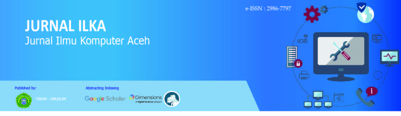 Jurnal Ilmu Komputer Aceh (ILKA) merupakan jurnal berbasis OJS 3 yang dikelola oleh program studi Informatika Fakultas Ilmu Komputer Universitas Almuslim Bireuen - Aceh dengan e-ISSN 2986-7797 (online). Artikel yang diterbitkan pada jurnal ini merupakan hasil penelitian dosen dan mahasiswa di bidang ilmu komputer. Jurnal ILKA menerbitkan tiga volume setiap tahun, pada bulan Fabruari, Juni dan Oktober tiap tahunnya. Setiap jurnal yang diterbitkan melalui proses double-blind review dalam proses review suatu artikel yang akan disajikan di mana suatu artikel di nilai oleh reviewer yang tidak mengetahui identitas penulis. Jurnal ILKA yaitu artikel dalam bentuk hasil penelitian, dan artikel konseptual yang mencakup bidang ilmu komputer, yaitu: Sistem Informasi, Informatika, Artificial Intelligence, Jaringan Komputer, Data Science, Rekayasa Perangkat Lunak, Internet of Thing, Teknik Komputer dan Multimedia
